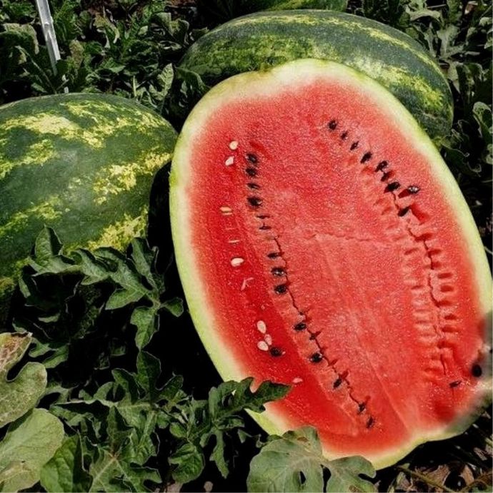 Плоды овальные, крупные, весом 11–14 кг, с плотной полосатой кожурой, отлично подходящей для транспортировки и длительного хранения. Мякоть ярко-красная, хрустящая, очень сладкая, без прожилок, с небольшим количеством семян. Содержание сахара достигает 10–12% Brix.