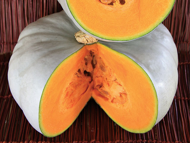 Плоды плоскоокруглой формы, без ребер, массой 3-5 кг. Имеют оригинальную серую окраску кожуры и плотную оранжевую мякоть, которая быстро набирает вкус после уборки. Гибрид отличается высокой устойчивостью к механическим повреждениям при уборке, что критически важно для коммерческого производства.